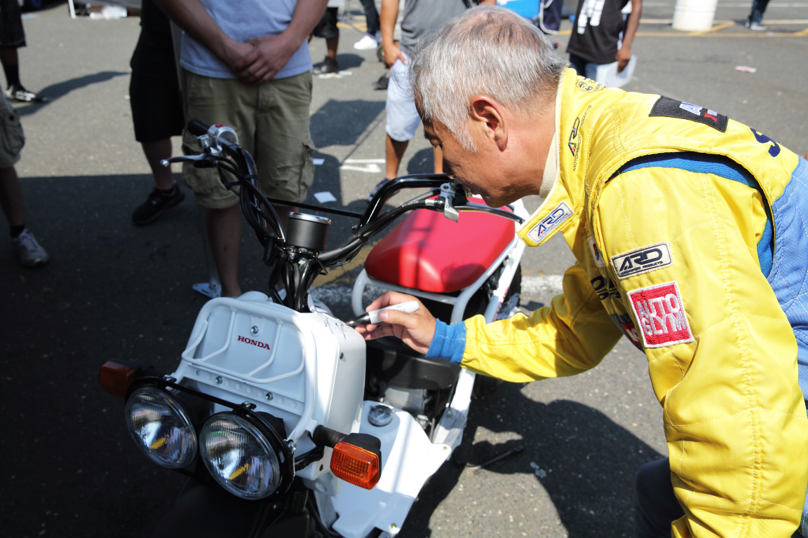 実に二日間でサイン用に準備した3000枚のポスターが早々に無くなると、今度はTシャツや、帽子、ベビーバギー、スーパーカブ、ラッカス、自分の車の部品を外してきたり、はたまたクルマ、バイク、ヘルメット、その後は手や背中、スキンヘッドの頭、女子の胸、もうホントにいろんな場所にサインを求められました。